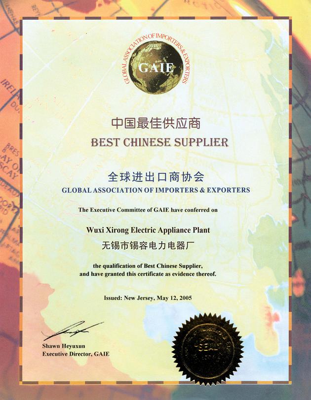 無錫市錫容電力電器有限公司,2005年,7月12號被全球進出口商協(xié)會評為中國最佳供應(yīng)商。
